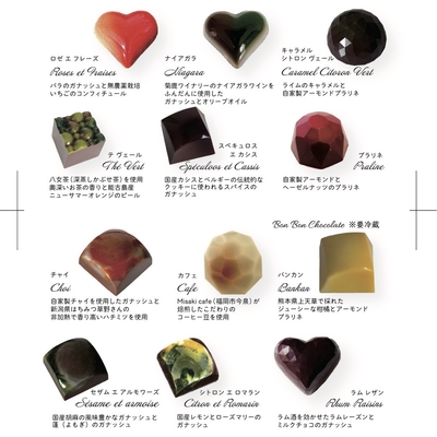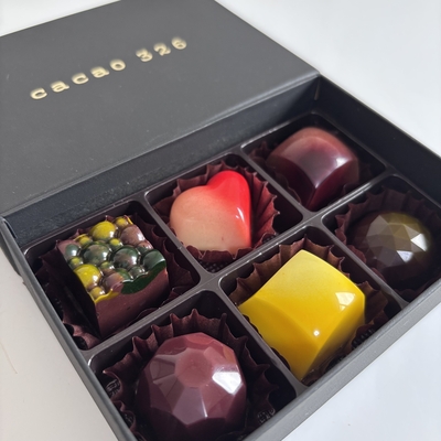 世界各地のビーントゥーバーチョコレートのカカオの風味と厳選した農家さんの美味しい素材などを合わせたおすすめ6種です。(ノンアルコール) 一粒一粒手作業で丁寧に作り上げてます。 お召し上がりの際は,冷蔵庫から出し5分ほど室温に戻してお召し上がり頂けますとより風味を感じて頂きます。 (紙袋は、別売りとなります。)